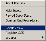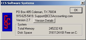 Use this command to display the copyright notice and version number information for your copy of the CCS Accounting Program. 1. Help, Click on About CCS....., 2. Click on the Version Details button 3. This will display the build version of your program.