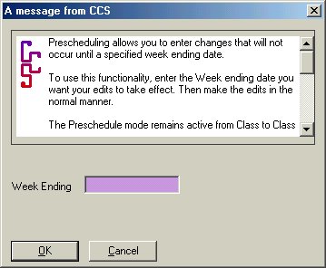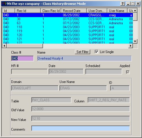 The Preschedule Button allows you to make changes to CLASS records that will not take effect until the date that you specify. The process is thoroughly discussed in the CCS Message textbox pictured above. Enter the date that the edits you are about to make should take effect. Every change that you make to any CLASS while in the Preschedule mode becomes a pending record that is not put into place until the desired date. These records can be deleted prior to the target date--see HISTORY, below. CCS Payroll tracks all changes made to any Class via the Class Form. This history is viewable by clicking on the History Button. When you click on this button, you are taken to the Class History Browse screen (see below). CCS looks to see if the CLASS that you have selected has any History records. If so, a scrollable list of this history is presented so that you can select the desired one. If not, you are so informed.