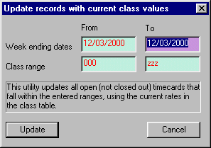 History records cannot be added or edited. If a record has not been Applied (which will only be true if the record was created via the Preschedule process), then you can delete it via the normal Delete options. Otherwise, all you can do is view these records and add a comment where desired. As pictured above, the Shift 2 Regular Bill Rate for Class 04D (Overhead Hourly 4) was changed from 12.00 to 12.10 on June 29, 2002. Comment:[30 Alpha-numeric Characters] Add a brief comment to this History record. When you make a change to the rates of any CLASS CODE, you may elect to have these rates reflected in any existing timecard and paycheck records that are not yet closed. Any new timecards or paychecks created will always reflect the current values of the CLASS table. Pressing the Update will present a dialog (shown below) that will allow you to specify the range of existing records to be updated using the current rates. Note: It is only necessary to update one time after you have finished all desired changes to all CLASS CODES, and then only if you want the current rates applied to existing timecards or paychecks.