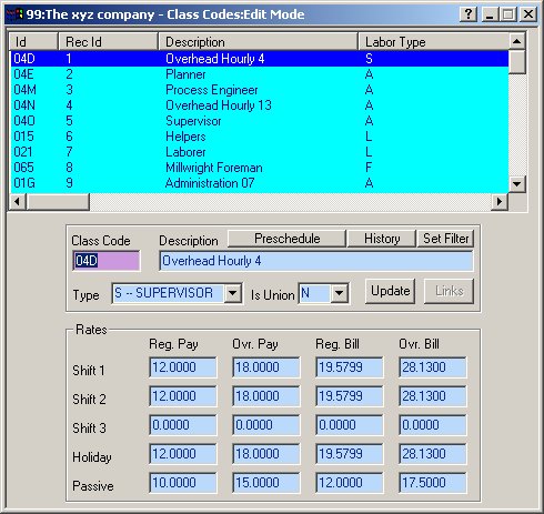 See Edit Modes for more information on the Edit modes used by most CCS forms. The Controls of the CLASS Form: Note: The values shown below in square brackets represent the default range applicable to each control; however these ranges can be configured to allow additional values (or restrict values). See Validation Methods for more information. CLASS CODE.:[1 to 3 alphanumeric characters] The CLASS CODE is used to uniquely identify a CLASS. This will be the value used to represent a particular CLASS throughout the program. Note:As shipped, the VALIDATION logic expects a value of 000-0zz. CLASSES starting with a alphabetical character (letter instead of number) are not allowed so as to enable the automatic searching of CLASSES by entering any portion of the CLASS description in the CLASS CODE field. If you wish to change this functionality, simply remove the CLASS_ALPHA_SEARCH parent from the controls validation method. DESCRIPTION:[1 to 25 alphanumeric characters] The CLASS DESCRIPTION is used to describe the CLASS. This description will appear on most reports pertaining to CLASSES. The CLASS TYPE is used to designate the CLASS. The choices are as follows: <L>abor, <S>upervisor, <F>oreman, <E>quipment or <A>dmininstration. These designations are generally used in reporting; however some CCS routines such as the Events Auto Create Mode utilize this field directly. Note:You may add additional designators by changing the validation method for the CLASS TYPE. Enter <Y>es if this class will be used by union employees, else enter <N>. RATES:[-9999.9999 - 99999.9999] The rates determine both the amount paid to an employee who is given this CLASS CODE in a paycheck or timecard as well as the amount billed out for that employee's time. Shifts 1, 2, and 3 generally represent day, evening and night shifts, while shift 4 is holiday pay and shift 5 is passive pay (show-up pay). If you will not be using a particular shift, then just enter 0.00 for each of the entries on the line. After you complete the above entry, the CLASS will automatically be validated and saved. Click OK on the SIDE TOOLBAR when you are ready to close the CLASSES form. Note: If you used the Add mode and not the Define mode to create a CLASS you will need to press the ESC key or click CANCEL when you are done adding CLASSES. This is necessary because once you start the ADD mode anywhere in the CCS Programs, the add mode is automatically reinstated for you after each save (i.e., a new, blank record is initialized) until you cancel it or close the Form.