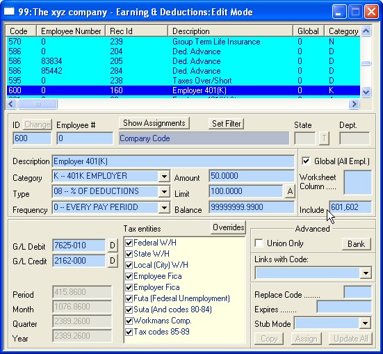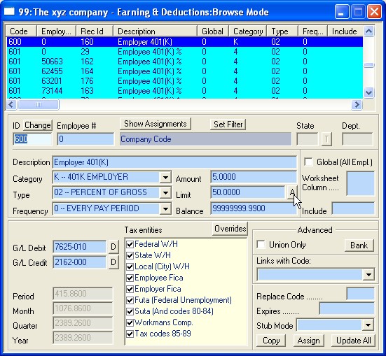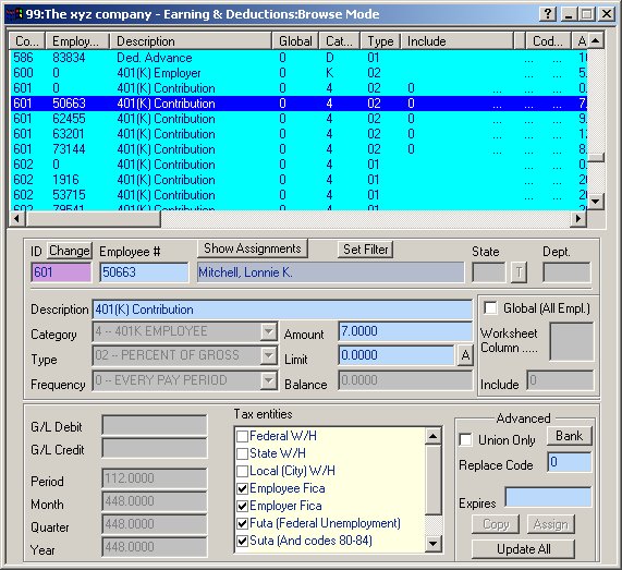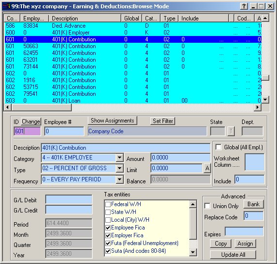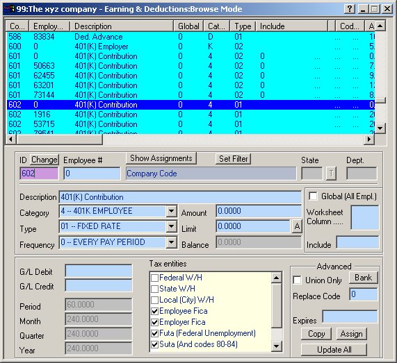 NOTE: The numbers assigned to these Codes (600, 601, 602) are assigned by the user who creates the Codes. Please use Code ID numbers between 500 and 999 for deduction type codes. Every Code is first created at the Company Level, with an Employee # of zero. The Company Level code allows the user to define certain aspects of the Code to be shared by all Employees who utilize the code. These areas are not editable at the Employee Code Level. (See the picture below -- all disabled fields are data that can only be set at the Company Level.) In the above picture, we are browsing Code 601. Let's examine it in some detail: We have chosen to use the number 601 to define Employee 401(K) percentage-based contribution. We have set the Category to "4" -- 401K EMPLOYEE and the Type to "02" -- PERCENT OF GROSS. We have unchecked the Federal, State and Local W/H checkboxes, since the 401K is a pretax deduction as far as these withholdings are concerned. We have not checked the Global checkbox, since not all employees of the XYZ Company are eligible for the 401k Plan. Lastly, notice that we have set the Amount, Limit and Balance to Zero. These values will be overridden on an employee-by- employee basis by Employee Level Codes. An example follows.