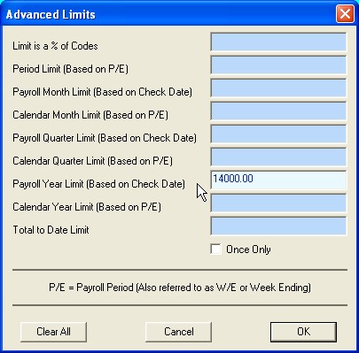Bringing the math all together. Lets say our employee has earned $1000.00 for the week, and they have a 401K setup to defer 2.50% of their gross pay to their retirement account. Based on these amounts, the employee's 401K deduction will be $25.00 (on this paycheck.) The employer deduction will then be calculated. First, the employer code (code 600) will be calculated at 5.00% of the gross pay, yielding $50.00. Then the advanced limit will be calculated, and the program will sum codes 601 and 602 on this paycheck, (in this case only 601) and determine the value to be $25.00. Next, this amount (the sum of codes 601 and 602) will be multiplied by 50.00 percent (the amount we entered as a limit in the main dialog) to determine the advanced limit and will find it be $12.50. Since the initially calculated total for code 600 is $50.00 and this amount exceeds the advanced limit, the total for code 600 will be reduced to the advanced limit. The resulting employer match will be $12.50. What would happen if the employee deferred more than 5.00% (more than the employer match). Lets follow the math again. Using the same $1000.00 for the week, and deferring of 15.00% of their gross pay to their retirement account, the employee's 401K deduction will be $150.00. The employer deduction will then be calculated at 5.00% of the employee's gross pay, yielding $50.00. Then the advanced limit will be calculated, and the program will sum codes 601 and 602 on this paycheck, (in this case only 601) and determine the sum of these codes to be $150.00. Next, this sum will be multiplied by 50.00 percent (the entered limit) to determine the advanced limit which of course is $75.00. Since the initially calculated total for code 600 is $50.00 and this does not exceed the advanced limit (of $75.00), the total as calculated will remain. The resulting employer match will be $50.00. When you enter a Limit in a non-tax code the program requires a balance. Enter a very large balance so that it will never reach zero. If this declining balance reaches zero, the code will become disabled.