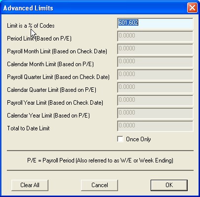 We have entered codes 601 and 602 on the top line of the Advanced Limits dialog. This tells the program that the amount we entered in the limit field (50.00) is a percentage of the sum of all codes in this list. In our case, the sum of codes 601 and 602 (an employee will generally only have one of these, not both), will be used to determine the limit of the employer match.
