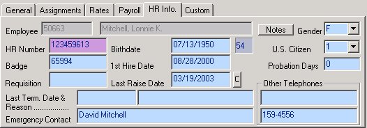 If the employee is assigned a Badge #, then enter that number here. Enter the date that the Employee was first hired by the Company. Enter the date that the Employee was last given a raise. Note: This field is automatically updated when you increase the employee's regular payrate (payroll tab.) however you may override this value at anytime. Probation Days:[Real Value] If this Company utilizes a probationary period for new hires, enter the number of days for this period. Requisition:[Real Value] If the employee has been hired or is currently employeed via a REQUISITION Number, then enter that number here. Enter the date that the Employee was last terminated by this Company. Last Term. Reason:[30 Alpha Characters] Optional field. Enter a short description of why the Employee was last terminated.. Emergency Contact:[30 Alpha Characters] Enter the name of a person that can be contacted in the case of an emergency. Emergency Telephone:[###-###-####] Other Telephone Numbers:[###-###-####] Enter any other telephone number (Cell phone for example.) in the upper field, use the lower field to enter the Telephone Number that can be used in case of an emergency.