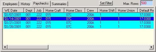 The Paycheck Tab allows you to view a scrollable list of all Paychecks generated by this program. You cannot make any changes to the data in this screen; it is presented as a convenient way to see Payroll transactions for any selected Employee.
