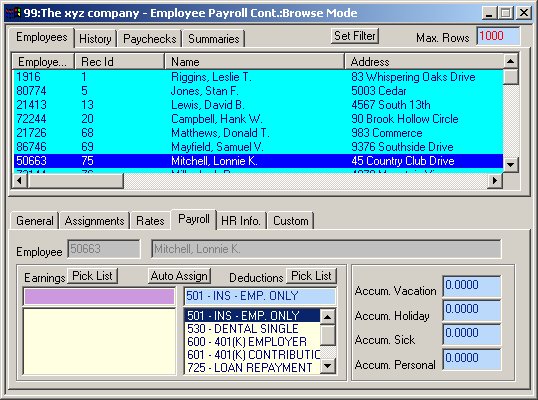 This area of the program allows you to add or remove Employee-specific Earning and/or Deduction Codes. NOTE: Globally assigned CODES will not appear on this tab. Earnings:[Any valid Earnings Code] There are two ways to locate a desired Earnings Code: