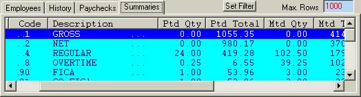 The Employee Summaries tab provides you with a cross-tabbed analysis of all pay activity for the selected Employee. Each row in the grid represents one Code that appears on an Employee's check(s) during the targeted period. Totals for Period to Date, Month to Date, Quarter to Date, and Year to Date are shown for every Code. When you click on the Summaries tab, a dialog box appears: