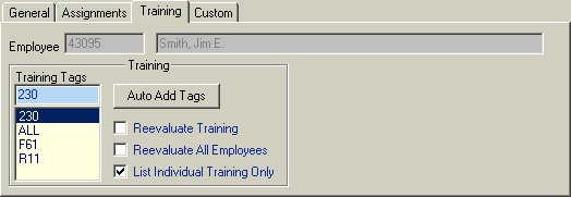 Reevaluate Training:[Checked or Not Checked] When you create a new EMPLOYEE or change TAGS to an existing EMPLOYEE the Reevaluate Training Checkbox is automatically checked for you. You can check or UN-check this box as well. When checked the reevaluate routines will automatically be scheduled as soon as you save the current record, updating all Training Requirements for the EMPLOYEE based on the new TAGS. Reevaluate All EMPLOYEES:[Checked or Not Checked] Same as Reevaluate Training, however you must manually check this box. If checked all EMPLOYEES are reevaluated. This process may take several hours for very large databases.