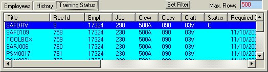 This tab provides you with an overview of the selected Employee's Training activity. You will be able to see the Status, Date Required, Date Scheduled, Date Completed, Refresher Date, etc. for each Training record created for the subject Employee. You cannot change any of the data in this tab--it is read only. Its purpose is to provide a readily accessible summary of all of the training activity for a single Employee.