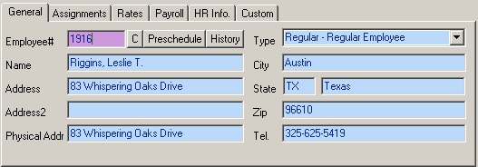TOOLBAR or 3. Complete the Form as described below. After the last entry is completed, the record will be saved automatically. To Edit an existing EMPLOYEE: 1. Select Maintenance|EMPLOYEES from top menu bar or go to the Home Menu and click the "EMPLOYEES" button. 2. Enter the EMPLOYEE# for the EMPLOYEE you wish to edit or any portion of the employee's last name (see Tip below) in the EMPLOYEE# field. Press ENTER. If the EMPLOYEE exists, he or she will be displayed in the Form. (To search alphabetically by name, see Alpha Search.) Additionally, you can use the RECORD buttons to locate a particular EMPLOYEE or select an EMPLOYEE from the Employee LIST control in the upper portion of the Form. 3. Complete any changes needed as described below. Tabbing past the last entry, moving records or clicking ADD or OK on one of the TOOLBARS will validate and save your changes. Tip:You can select an EMPLOYEE alphabetically by entering any portion of the last name in the EMPLOYEE# field and clicking Enter. A list off all EMPLOYEES matching the entered text will be generated and displayed. Click on the desired EMPLOYEE in the listing; his or her record will be selected and displayed in the main Form. The Wild cards * and ? (* matches one or more characters, ? matches one character only) can be used in the search text. This AlphaSearch is available in most areas of the program where you would normally enter an EMPLOYEE#. (See Alpha Search for more details.) To Delete an existing EMPLOYEE: 1. Select Maintenance|EMPLOYEES from top menu bar or go to the Home Menu and click the "EMPLOYEES" button on the Home Menu. 2. . Enter the EMPLOYEE# you wish to delete in the EMPLOYEE# field (see Tip, above). Press ENTER. If the EMPLOYEE exists it will be displayed in the Form. Additionally, you can use the RECORD buttons to locate a particular EMPLOYEE, or select an EMPLOYEE from the Employee LIST control in the upper portion of the Form. 3. Click the DELETE button on the SIDE TOOLBAR or You may also delete EMPLOYEES by highlighting a EMPLOYEE in the Employee LIST control and clicking the DELETE key. See Edit Modes for more information on the Edit modes used by most CCS forms. See Importing Data for information on importing initial data. The Controls of the EMPLOYEES Form: We will examine the General Tab controls below. However, since EMPLOYEE data is utilized by several modules in CCS Accounting (Payroll, TimeKeeper, Training, and Human Resources), links are provided to the remaining tabs.
