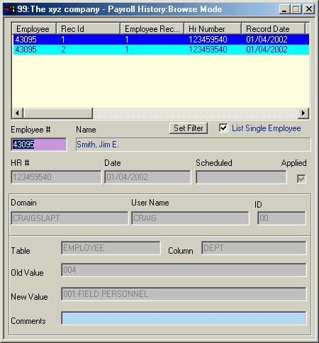 History records cannot be added or edited. If a record has not been Applied (which will only be true if the record was created via the Preschedule process), then you can delete it via the normal Delete options. Otherwise, all you can do is view these records and add a comment where desired. Comment:[30 Alphanumeric Characters] Add a brief comment to this History record. List Single Employee:[Checked or Unchecked] If this field is checked, History records only for the selected Employee will be visible; otherwise, all History records will be available for viewing. NOTE: A large number of History records can be created across time. Bringing all of them into this form for viewing can place a strain on your network resources. You should normally leave this field checked.