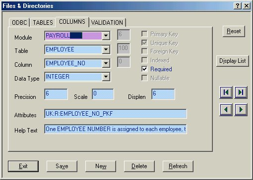 Following the index type is one of the following: No Entry: (Blank) There are no other attributes for this Column. The R: TAG is a lead into a required Validation Method. With this tag, this column must be completed and it must pass the validation specified by VALIDATION NAME wherever it appeares. To change the validation rule that is associated with a column simply change the value in VALIDATION NAME. Note: Do not enclose in square brackets []. The Column shown above utilizes the VALIDATION RULE -- EMPLOYEE_NO_PKF. Tip: The easiest way to find the validation rule associated with a particular control is to Right Click in the control. Select VALIDATION from the context menu. If no validation for the column exists you will be asked if you wish to create one. If you click YES the define mode will be initiated for the VALIDATION FORM. After completing the rule the CCS Program will perform the steps necessary to associate the Validation rule to the Column, and all controls associated with the Column. V:[VALIDATION NAME]: Same as above, but the column is not required unless overridden by checking the Required checkbox in either the Column Form or Validation Form. Note: Which required check box you check to make a column required determines the error message that is given to the user when a column is not completed. Checking the Required Check box in the Column Form will generate the message "COLUMN NAME is a required column", whereas checking the REQUIRED check box in the VALIDATION form will generate the message that is specified in the ERROR MESSAGE of the VALIDATION FORM. N: Same as no entry above. This column allows entry of up to 256 characters and allows you to specify the actual text used for POPUP help (Shift-F1 help or What's This help). This can be changed at any time and takes effect the next time the program is restarted.