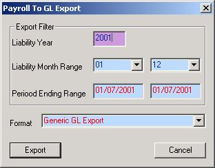 Payroll to G/L Export Dialog The GL Export Dialog option provides you with a very flexible tool for exporting your Payroll activity to a General Ledger system.