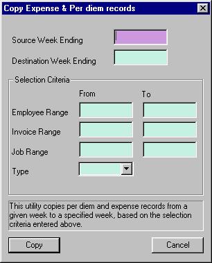 4. Fill in the parameter controls as required. When you are satisfied that the parameters for copying the Per Diem to the new week ending are correctly entered into the Copy Expense & Per diem records form, click on the Copy button at the bottom of the form. CCS TK will create a copy of every Per Diem record that falls within the parameters you established on this form. NOTE: Once Expense & Per Diem records have been COPIED, the process cannot be reversed. You would have to either restore the data from backup or correct/delete each COPIED record one at a time. The Controls of the Copy Expense & Per Diem Records Form: Note: The values shown below in square brackets represent the default range applicable to each control; however, these ranges can be configured to allow additional values (or restrict values). See Validation Methods for more information. Source Week Ending:[MM/DD/YYYY] Enter the Week Ending Date for the Expense/Per Diem records that are to be copied. Destination Week Ending:[MM/DD/YYYY] Enter the Week Ending Date that is to be used for the new Expense/Per Diem records. Employee Range From:[1 to 6 numeric characters] If you want to copy Expense/PerDiem records for a group of employees whose Employee Numbers are consecutive, enter the beginning Employee Number here. Employee Range Through:[1 to 6 numeric characters] If you want to copy Expense/PerDiem records for a group of employees whose Employee Numbers are consecutive, enter the ending Employee Number here. If only one employee is involved, put the same Employee Number here that you put in the Employee Range From. Invoice Range From:[1 to 6 numeric characters] If you want to copy Expense/PerDiem records for a range of Invoices that are consecutively numbered, enter the beginning Invoice Number here. Invoice Range Through:[1 to 6 numeric characters] If you want to copy Expense/PerDiem records for a range of Invoices that are consecutively numbered, enter the ending Invoice Number here. If only one invoice is involved, put the same Invoice Number here that you put in the Invoice Range From. Job Range From:[1 to 3 alphanumeric characters] If you want to copy Expense/PerDiem records for a range of JOBS that are consecutively labelled, enter the beginning Job Number here. Job Range Through:[1 to 3 alphanumeric characters] If you want to copy Expense/PerDiem records for a range of JOBS that are consecutively labelled, enter the ending Job Number here. If only one JOB is involved, put the same Job Number here that you put in the Job Range From. TYPE:[D,L,O] If you only want one specific TYPE of Expense/Per Diem, enter the appropriate value here.