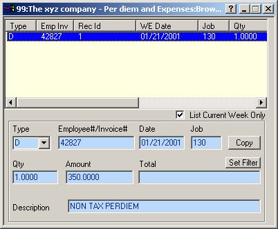 As shown above, the active COMPANY is "The xyz company #99". The user is viewing (Browse mode) the Expense for and Employee#/Invoice# "42827", which has been defined as "NON TAX PERDIEM". Note: When you select a Per Diem/Expense record from the LIST control (click on a line) in the upper portion of the Form, the associated Per Diem/Expense record will be displayed in the bottom portion of the Form. You may also delete a Per Diem/Expense record by highlighting a Per Diem/Expense line and clicking the DELETE key. Clicking on the Column heading will sort the list by that Column, Clicking again on the column will toggle the sort order (Ascending vs. Descending). Note: Although this form contains predefined controls, they may be configured to meet your specific "Business Rules". See Validation Methods for more information on customizing controls. See The Mouse verses the Enter/Tab Keys for information on moving through a form. See Importing Data for information on importing initial data. As the name implies, the Per Diem/Expense Form allows entering either Per Diem records or "Other" expenses. A Per Diem/Expense record is a non-worked expense that needs to be included in the total billing amount. Per diem is a benefit given to an employee who is working away from home. This per diem amount may be included on their paycheck, yet is not a part of their Timecard. Other expenses may include items such as reimbursements, equipment charges, supplies, etc. Note: Unlike most entry/edit forms where the record can be looked up by the entry made in the first control, the Perdiem/Expense record uses the first three controls (TYPE, #, and DATE) to create a unique lookup combination.