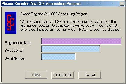 To TRY this CCS Accounting Program, simply click the TRIAL button--you need not fill out the form. An evaluation period (generally 30 days) will be started. The Evaluation version is not a stripped down version, but incorporates all functionality of the registered version. However, it will only operate for the prescribed number of days. Once this trial period expires you will you will need to register the program if you wish to continue using it. We hope you will find CCS Accounting to be a great tool and decide to register it. We appreciate any comments you might have good or bad. To Register CCS You will need to have Contacted CCS to make purchase arrangements. At that time you will be provided a Software Key and Serial Number. If you wish to register by mail please include a registration name in your correspondence. This name must be a least 5 characters and should be either your full name or your company's name. Please Check our web site for current pricing information. You can re-register CCS Accounting at any time by selecting Help|Register CCS from the main menu while at the Welcome Screen. Thank you for using CCS Accounting.
