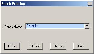 As pictured above, the user has created a batch print job named Default and is prepared to manipulate it: --Done: Exit the dialog. --Define: Each batch print job is assigned a name. If you want to create a new set of reports to batch print, enter a name for the new batch print job in the combo box and then click Define. If you want to edit an existing batch print job, select it in the combo box and then click Define. In either event, you will see a dialog that allows you to select the reports that you want to assign to the selected batch print job. For each report, you can
