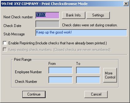 The Print button prints the selected report to the printer. The report is printed as defined; no additional selection criteria, sorting information, or printer setup is requested or utilized. If you have opted to print paychecks, the following dialog appears:
