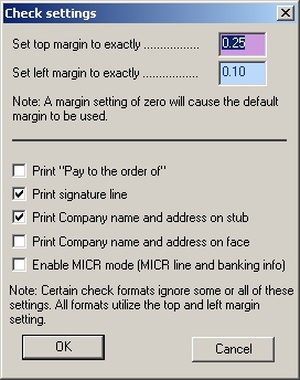 *Note: Certain check formats ignore some or all of these settings. All formats utilize the Top and Left Margin setting.