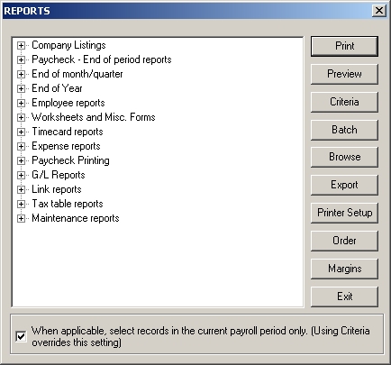 NOTE: If you want to use Company 99, the sample company, in order to run sample reports with data, use one of the following dates in the Week Ending textbox of the Welcome Screen: 1/4/04, 1/11/04, 1/18/04, 1/25/04 or 2/1/04. The reports dialog allows you to configure your printer and select a report to print, export, or preview. Click on a button for an explanation of what it does.