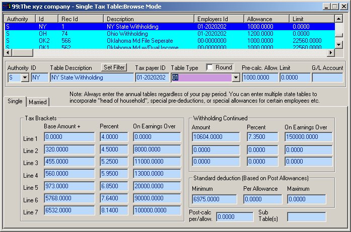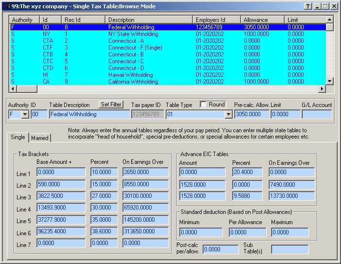 This form is accessed by clicking on Codes in the Home Menu and then Tax Tables in the Codes & Maintenance Menu. As depicted above, the active COMPANY is "The xyz company #99". The user is viewing the Federal Tax Table. Note: This form contains controls with predefined labels and validation routines. However, these controls may be configured to conform to your specific "Business Rules." See Validation Methods for more information on customizing controls. See The Mouse verses the Enter/Tab Keys for information on moving through a form. See Importing Data for information on importing initial data. A TAX TABLE is a collection of data that is used in the calculation of Federal, State, and/or Local withholding taxes. TAX TABLE Maintenance: To Add a new TAX TABLE: 1. Select Maintenance|TAX TABLE from top menu bar or go to the Home Menu, click the "Codes" button, and then "TAX TABLE" button on the Codes Menu. 2. Click ADD on the SIDE