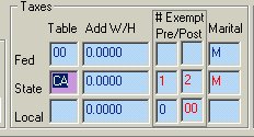 Notice that the State Table control contains the entry "CA." This is because Company 99 has defined a State Tax Table for California and given it an ID of "CA." Entering "CA" into his State Tax Table ties him to the proper state tax table. Since one of his deductions is estimated, a "1" is entered in his State # Exempt Pre control. A "2" is entered into his State # Exempt Post control representing his remaining deductions. Note: CA employees, should be setup using the "Pre" exempt column in the employee file to represent the "Estimated Deduction" (Table 2), entered on their DE-4, the "Post" allowance, is then used to calculate the standard deductions and exemptions allowances (Table 3 and 4) . If the employee does not enter a value for the "Estimated deduction" (or fill out a DE-4) then enter 0 in the "Pre" exempt column. Note: AL employees, should be setup using the "Pre" exempt column in the employee file to represent the number of dependents they entered on Line 3 of their A-4, the "Post" allowance, is used to calculate the standard deductions (20% of Gross) and personal exemption allowance (Line 1 and Line 2) . If the employee does not enter a value for the Line 3 on the A-4, then enter 0 in the "Pre" exempt column. An Alabama employee entering "0" for Line 1B of the A-4 must use the state Table "AL0" not "AL". All others (Single, Married and Head of Household will use the standard table "AL")