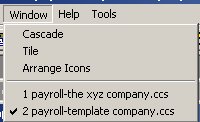 1, 2, ... command (Window menu) CCS Accounting displays a list of all currently open COMPANY DOCUMENT windows at the bottom of the Window menu. A check mark appears in front of the COMPANY DOCUMENT name of the active window. Choose a COMPANY DOCUMENT from this list to make its window (and its associated COMPANY) active.