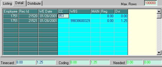 As pictured above, the CODING for the TIMECARD selected in the Listing Tab (EMPLOYEE # 1751, Week Ending Jan. 28, 2001) is displayed. The Employee's Name shows in the lower left-hand corner of your screen (not pictured above). Three coding categories for costing distribution have been previously defined (as pictured above): CC, WBS, and MAINT. This employee's Regular Time (8.00 hours) has been distributed to CC 953; his or her Overtime (1.25) was distributed to WBS 99838600329.